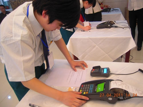 參賽選手熟練、準(zhǔn)確無誤的操作POS系統(tǒng),做到刷卡流程準(zhǔn)確、速度穩(wěn)定
