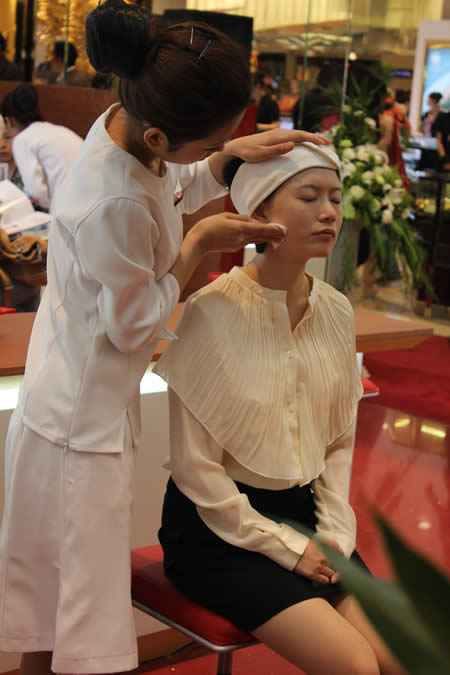 嬌韻詩專柜導(dǎo)購用專業(yè)手法為顧客現(xiàn)場做植物精華護理