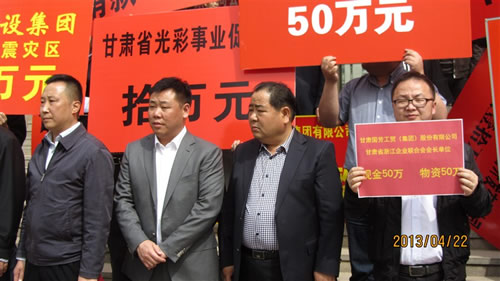 2013年4月22日下午15時(shí),在甘肅省政協(xié)一樓,由甘肅省委常委、省委統(tǒng)戰(zhàn)部部長(zhǎng)澤巴足,省委統(tǒng)戰(zhàn)部副部長(zhǎng)、甘肅省工商聯(lián)黨組書(shū)記、第一副主席吳繼德等相關(guān)領(lǐng)導(dǎo)出席了“甘肅省商會(huì)非公經(jīng)濟(jì)人士向四川雅安災(zāi)區(qū)獻(xiàn)愛(ài)心捐贈(zèng)儀式”。捐贈(zèng)現(xiàn)場(chǎng)眾多甘肅省非公企業(yè)向4月20日雅安市地震災(zāi)區(qū)進(jìn)行了捐贈(zèng),廣大愛(ài)心企業(yè)和人士用自己的實(shí)際行動(dòng)對(duì)災(zāi)區(qū)同胞奉獻(xiàn)了自己的真情和祝福。