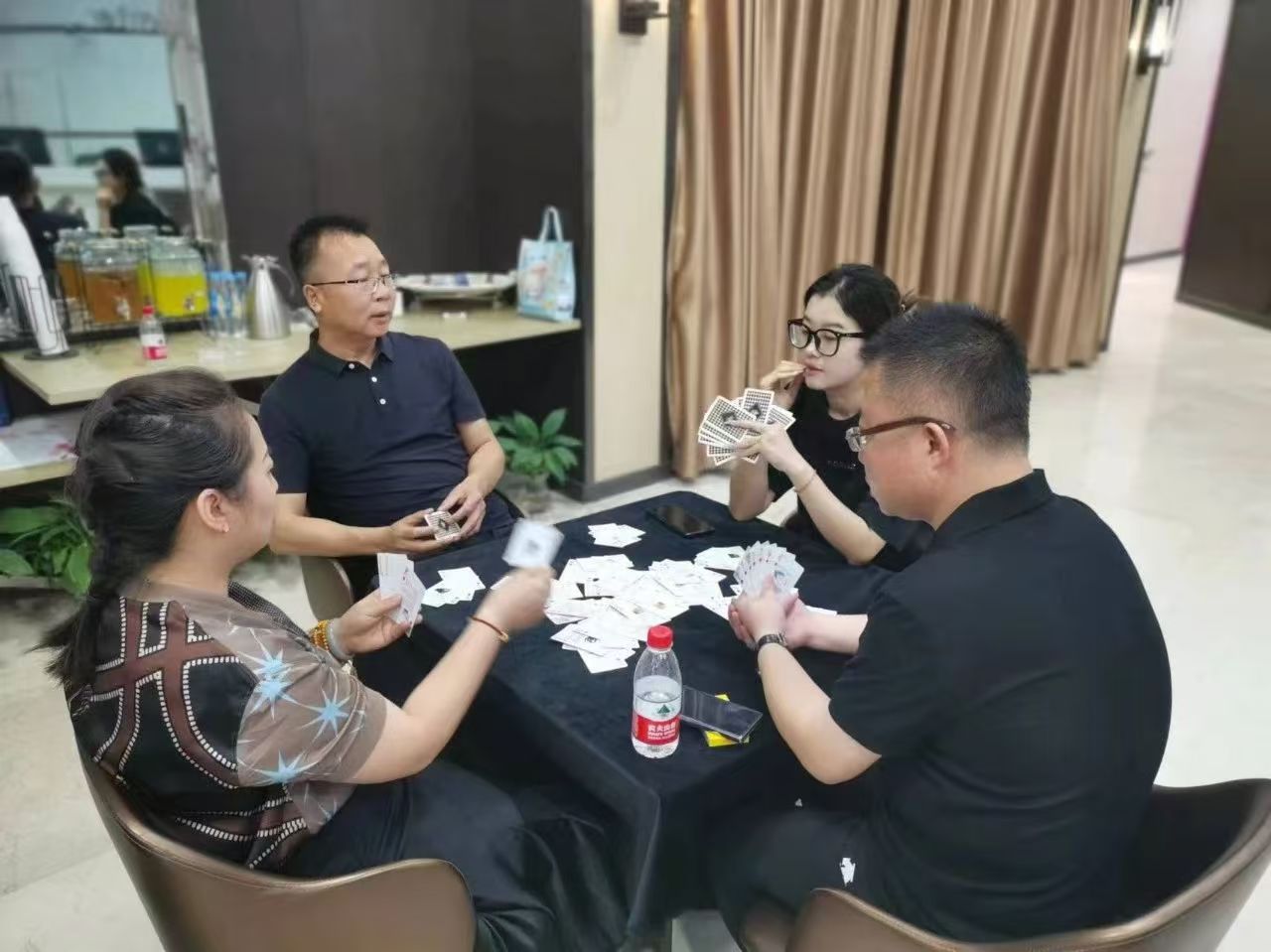 在運(yùn)動(dòng)會(huì)的摜蛋比賽現(xiàn)場(chǎng),氣氛熱烈而又緊張。一張張牌桌整齊排列,參賽選手們兩兩相對(duì)而坐,神情專注而投入。他們的目光緊緊鎖住手中的牌,大腦飛速運(yùn)轉(zhuǎn),思考著出牌策略。每一次出牌都顯得深思熟慮,又充滿了果斷和自信。